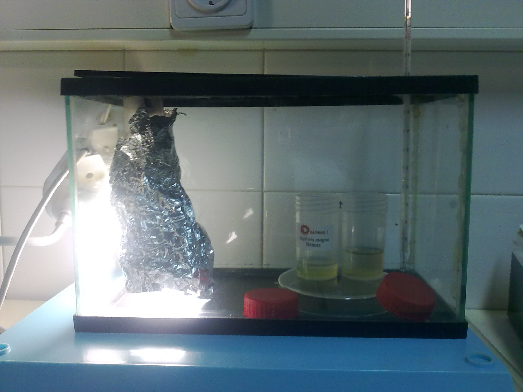 É necessário, em primeiro lugar, criar um meio propício ao desenvolvimento e reprodução das Dáfnias em laboratório. Para tal, utiliza-se um pequeno aquário com tampa para que a cultura de Dáfnias não seja invadida por microrganismos indesejados. Deixando que as Dáfnias se mantenham no seu frasco ou transferindo para um gobelé de maiores dimensões (nunca tapado completamente), consoante o número de organismo da cultura, insere-se no aquário. Para que a temperatura ronde os 20ºC utiliza-se uma lâmpada, também inserida no interior do aquário e envolvida numa folha de alumínio para que a luz não seja directa na cultura e, também, para aquecer o ambiente dentro do aquário. Um termómetro dentro do aquário irá ajudar o controlo da temperatura, para que se consiga manter as condições desejadas, sem provocar a morte das Dáfnias. Estes seres necessitam de um fotoperíodo, então à lâmpada terá de ser ligado um temporizador, programado para 16h de luz e 8h de escuro. Por fim, é necessário controlar os valores de pH e oxigénio na água com os aparelhos de medição de fácil utilização. O pH deverá ser cerca de 7, para que as Dáfnias se mantenham saudáveis, e a oxigenação superior a 6mg/L.